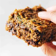 Almond butter chocolate chip zucchini bar with a bite taken out of it.