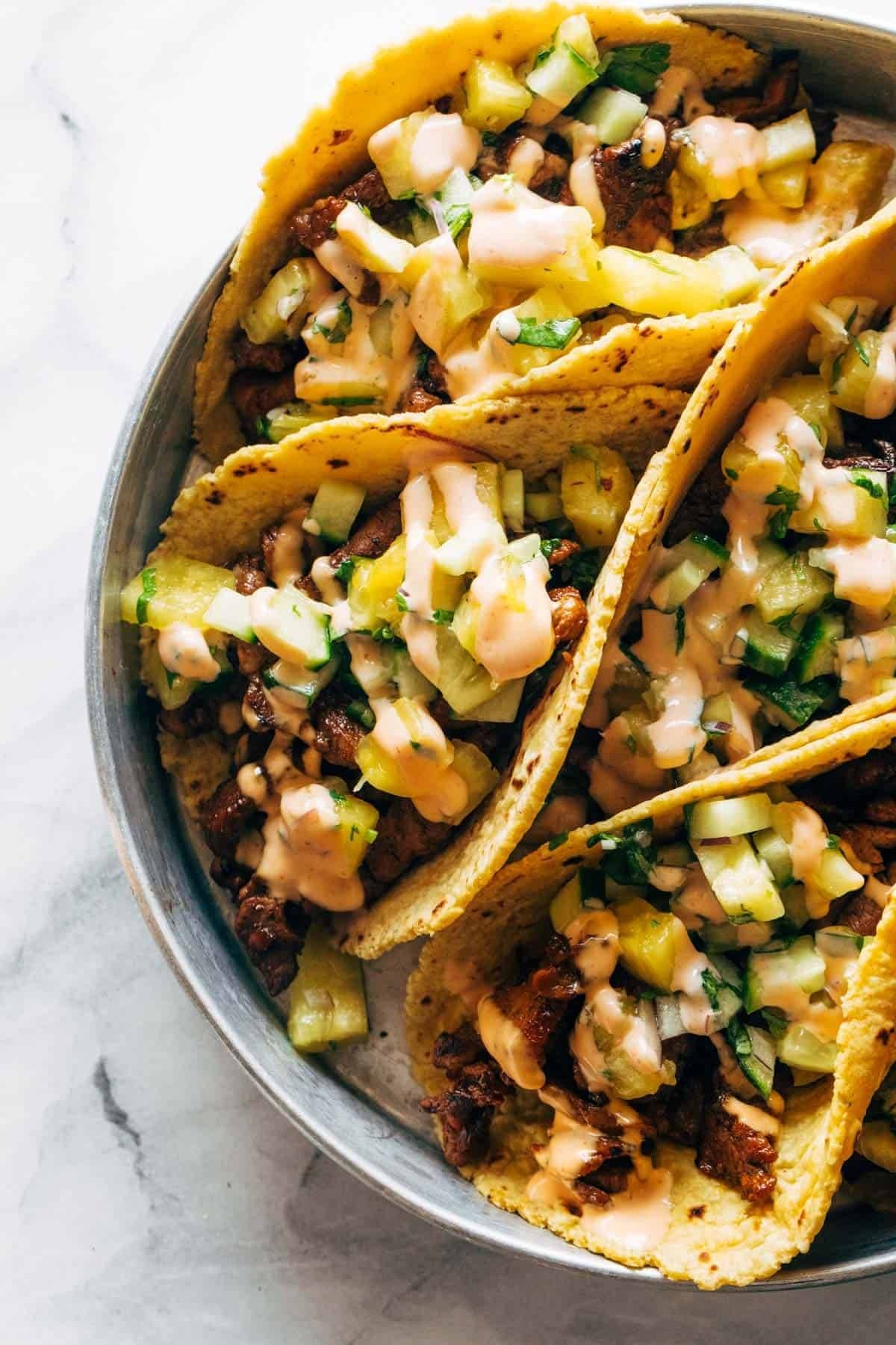 Let’s make pork tacos topped with sriracha mayo, obviously! Quick and easy to make with the best fruity pineapple salsa to boot.
