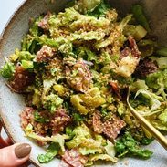 Wow this is salad is delicious we made it for having guests over twice in a row! Such a winner. It’s bright and fresh, but has so many great special flavors like the peppers. Instead of pepperocini peppers, we use banana peppers to tone down the spice a bit. I’ve also found you can cut the breadcrumbs in half, and it’s still plenty and delicious. Highly recommend!