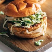 Close-up image of a chicken burger on a serving tray.